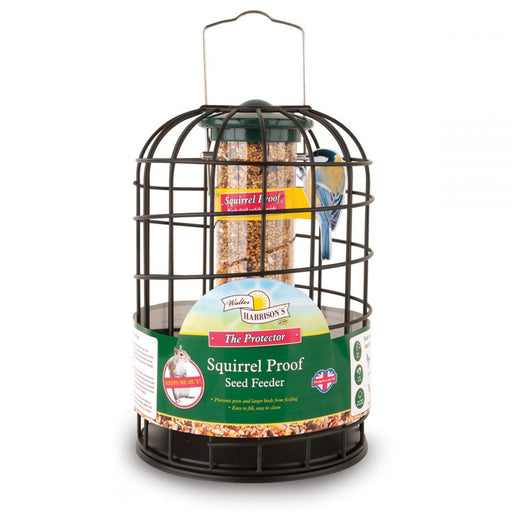Walter Harrisons Protector Seed Feeder is great for preventing squirells and larger birds from damaging feeders and stealing food.