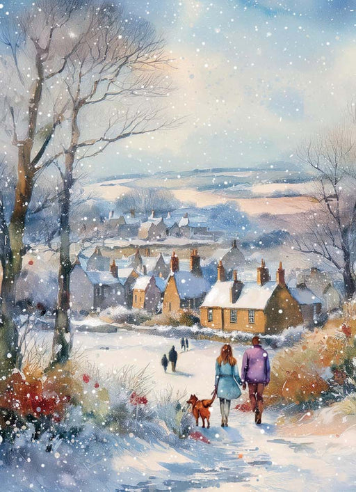 A charming winter village scene with a couple and their dog walking through the snow. Soft snowfall, cozy cottages, and a peaceful countryside sett...