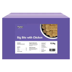 Crunchy, oven baked meaty bone shaped biscuits for dogs, Pointer Big Bite Biscuits are big on flavour and size and are ideal as a treat or reward f...