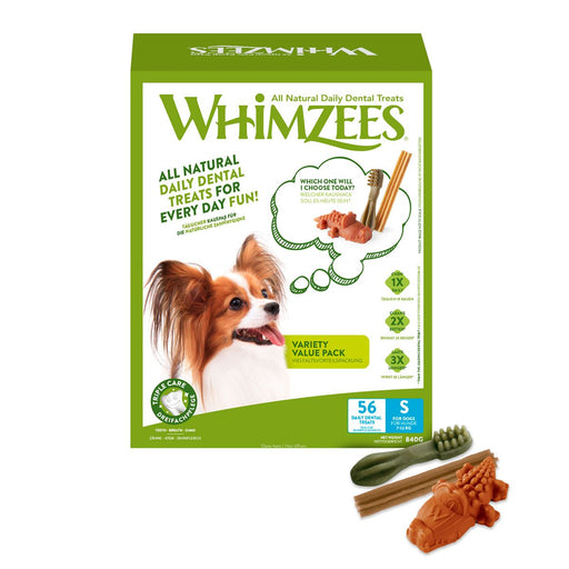 Assorted pack of Whimzees Alligator, Toothbrush and Stix, for small dogs from 7-12kg. Chew 1 x daily, 2 x more effective at removing plaque than...