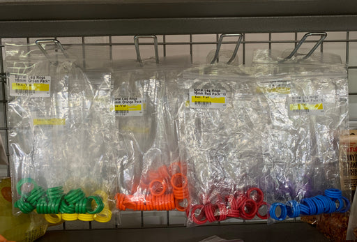 Pack of 10 spiral 16mm leg rings in a range of colours for easy identification. Simple to fit. Choice of Blue, Green, Pink, Purple, Red or Yellow.