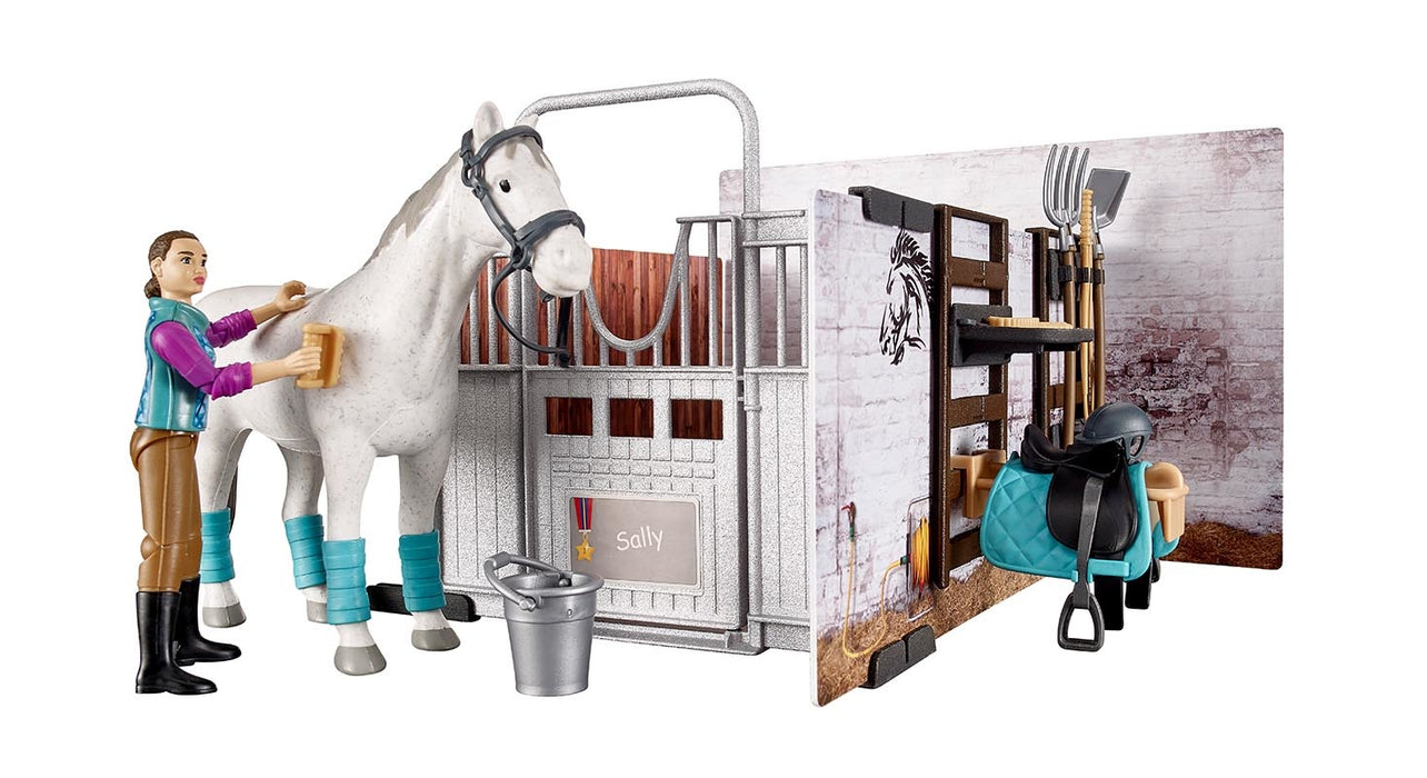 Content: -‚ stable equipment consisting of shovel, pitchfork, bucket and horse care; -‚ Riding equipment consisting of saddle, bridle, 4 gaiters; -‚ pivoted door for horse box; -‚ Wall rack with shelf and holder; -‚ double-side printed units with stands; -‚ Horse
