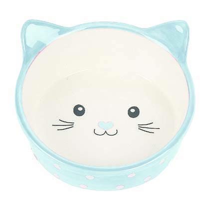 This ceramic feeding bowl is purrrfect for your little furry feline friends once he's licked the dish clean the outline of a cat face will add a little fun to mealtimes. Ceramic polka dot cat bowl Blue and white 39 x 29.5 x 43cm Dishwasher safe Suitable for food water and treats .Ceramic will help keep the water cool