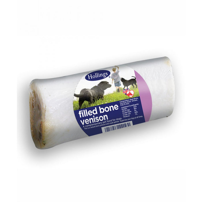 Why should humans have all the fun when it comes to snacking? Our furry friends also deserve the best and tastiest treats in the world for all the unasked for love and support. With this Hollings Venison Filled Bone, you can not only surprise your dog but also watch it all pumped and excited. Made with only natural ingredients and zero salt or sugars, this dog chew bone is healthy as well as delicious. Not only does it offer a tempting taste but also helps keep away plaque and tartar through the natural chewing process. This means, each time you pop this dog treat in front of your doggo, you're promoting healthy oral hygiene with everything natural. This dog snack has zero artificial colours, flavours or preservatives and is easy to digest, making it ideal for dogs with sensitive tummies. This venison filled bone encourages the natural chewing instincts of a dog and promotes strong jaws and healthy teeth and gums with improved dental hygiene. Weighing approximately 190g, this dog chew is tough yet irresistibly tasty for dogs of all breeds, ages and sizes. It is packed with just natural ingredients with high protein content.