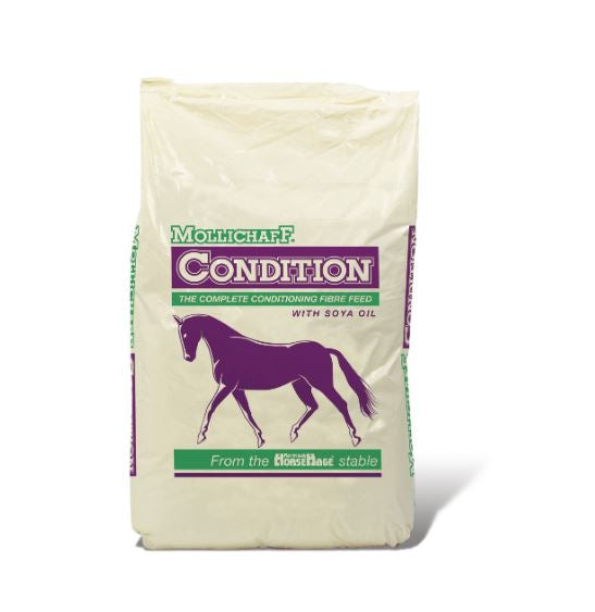 Mollichaff Condition Complete is a conditioning mix for horses, containing a balanced blend of alfalfa, dried grass, oat straw, fibre pellets, barley, soya flakes, soya oil and mint. It also includes Yea-sacc®, a prebiotic, vitamins, minerals and trace elements.