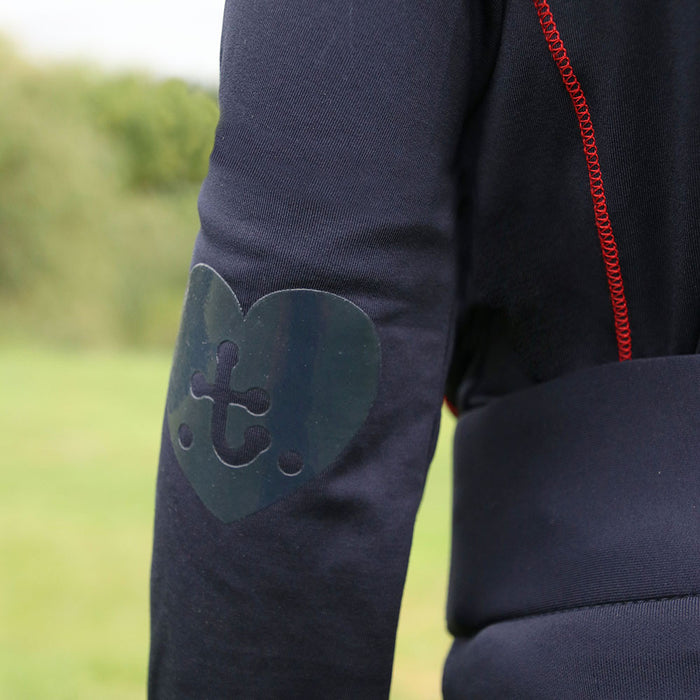 You can't beat a classic navy! This stunning base layer is made from a breathable, stretch material that allows for ease of movement and flexibility during any activity. Featuring a 3/4 zip for ease of fastening, Thelwell patches to the elbows and Thelwell character to the chest. Finished with red detailing for a stylish look. Matching items available!